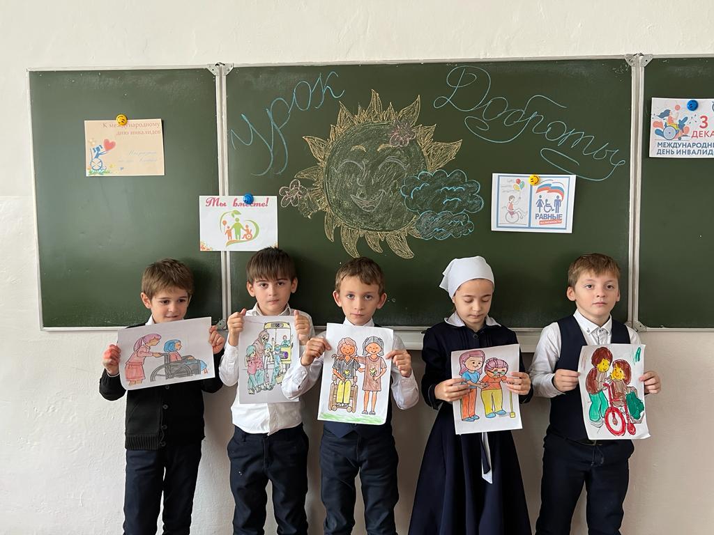 01.12.2023Урок доброты «Давайте уважать друг друга»3 декабря во всём мире отмечается Международный день инвалидов. Эта дата – дань уважения и признательности тем людям, которые вопреки всему стараются вести активный образ жизни, показывают пример стойкости и терпения. Международный день инвалидов – это напоминание о том, что рядом с нами живут люди, нуждающиеся в поддержке, внимании окружающих их людей. В этот день в МБОУ «СОШ №3 с. Ачхой-Мартан» в рамках декады инвалидов был проведен урок доброты «Давайте уважать друг друга». Ребята вместе с классным руководителем разобрали значение слов «доброта», «милосердие», «добрые дела». Все вместе размышляли, что такое доброта, какого человека можно назвать добрым, какие поступки его украшают? Ребята шаг за шагом познавали законы доброты: помогай другим людям бескорыстно, умей вежливо общаться с окружающими, не причиняй вреда живому на земле. Приводили примеры добрых дел по отношению к своим близким, к окружающим людям, вспомнили пословицы о доброте, привели формы вежливого обращения со словом «доброта», поговорили о том, много ли добрых слов в нашей речи.